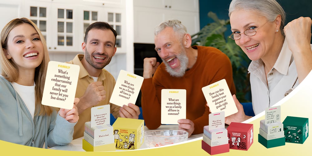 The moment you open the bundle, you'll find two beautifully designed decks: the Family Edition and the Couples Edition. While generic question cards can feel one-size-fits-all, our bundles are tailored to fit the mood and depth you're looking for—whether it's lighthearted fun across generations or intimate couple reflections.