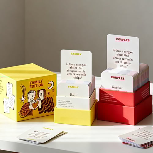 The difference is in the details. While other card sets ask generic questions, our prompts are developed with insights from relationship coaches and family therapists. Each card is printed on premium matte cardstock with a gentle finish, making them durable, easy to shuffle, and pleasant to hold—whether you're at the dinner table or around a campfire.